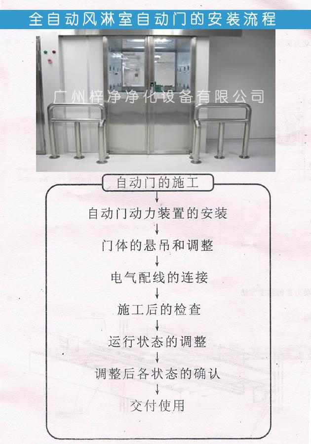 風(fēng)淋室安裝>>自動(dòng)門(mén)動(dòng)力裝置的安裝>>門(mén)體的懸吊和調(diào)整>>電氣配線的連接>>施工后的檢查>>運(yùn)行狀態(tài)的調(diào)整>>調(diào)整后各狀態(tài)的確認(rèn)>>交付使用。